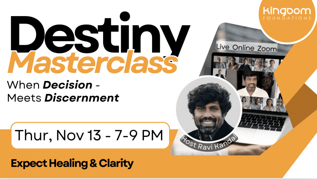 Destiny Masterclass: When Decision Meets Discernment — Join Ravi Kandal for a powerful live online experience that will shift how you make choices and hear God’s direction for your life. In this 2-hour masterclass, you’ll learn how to align your decisions with divine discernment — moving from confusion to clarity, hesitation to purpose, and good ideas to God ideas. This isn’t just another teaching; it’s an encounter designed to recalibrate your spirit for destiny.